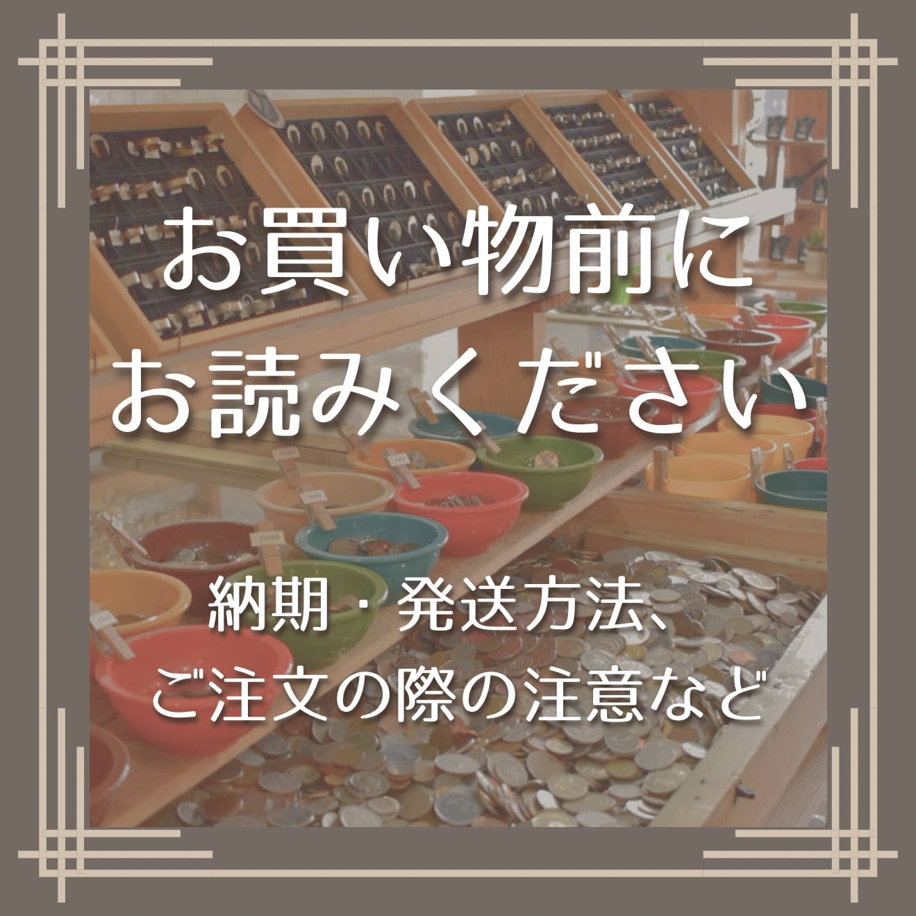 ●当店の商品と金属アレルギーについて ●お取引について ●納期について ●発送方法について ●アフターケアについて ●ご注文の際の注意 【当店の商品と金属アレルギーについて】 当店は海外の硬貨をリングやペンダントに加工して販売しております。世界中様々な硬貨がございますが、硬貨の素材もまた様々です。 銀貨と呼ばれるシルバー素材の硬貨もございますが、販売しているほとんどの硬貨は、いろんな金属が混ざっている合金製です。 合金製の硬貨について注意点がいくつかございます。 ①リング着用の際、指に色がつきます。また、金属アレルギーをお持ちの方は痒くなる事があります。 ②海や温泉の成分によってはコインが変色・サビる恐れがあります。 ③メッキ加工は施しておりませんので、着用していると少しずつお仕上がりが変化します。 金属アレルギーをお持ちの方はご注意ください。 コインペンダントなどは服の上からの着用をお勧めしております。 硬貨も金属ですので、海や温泉では外してください。 日常生活でかかる水などは特に問題ございませんが、強い薬品などは硬貨にかからないようにご注意ください。 また、水分はその都度拭き取っていただくと綺麗が長持ちします。(アフターケアもございますので"くすみ"が目立ってきた場合はご相談ください) 【お取引について】 当店にはたくさんの海外の硬貨がございます。 ネットショップ販売品の他、直接オーダーも承っておりますが、特にオーダーの際、 発行されていない年の硬貨(存在しない西暦)、新デザインに変わってしまった硬貨など、ご希望に添った硬貨をご提示できない場合がございます。 その際の説明など、文面ではやり取りしずらいものもありますので、直接お電話でのやり取りを推奨させてもらっております。 オーダーをご希望のお客様や、商品ご購入時に備考欄に記載いただきましたお客様は、お電話にて注文の確認をさせていただく場合がありますのでご了承お願いいたします。 【納期について】 ご注文いただいた商品は順番に、制作・発送させていただいております。 また、当店はネットショップの他、体験教室も運営しておりますので、土日祝日など混み合いが予想される際は商品説明欄の通り、制作に3日(ベルなどは1週間ほど)ほどお時間をいただくことがございます。 可能な限りお早めのお届けを心掛けておりますが、特にクリスマスシーズンなどは、お時間に余裕を持ってのご注文をお願いいたします。 【発送方法について】 これまで定形(外)郵便で発送しておりましたが、この度クリックポストを導入いたしました。 お急ぎの方や追跡をご希望の方は発送方法「クリックポスト」をご選択ください。 発送方法の違いは以下の通りです。 ●定形(外)郵便 送料無料、追跡・補償なし 土日配達なし、郵便受けに配達 遠方の場合お届けまで約1週間〜10日 ●クリックポスト 送料+185円、追跡あり・補償なし 土日配達あり、遠方でも最大3日ほどで到着 *定形(外)郵便に追跡番号はございません。 発送後の追跡は当店では出来ませんので、メッセージをいただいても回答しかねます。 *注文完了後の発送方法の変更はできません。あらかじめご了承ください。 例)定形郵便→クリックポストへ✖️ 【アフターケアついて】 当店ではネットショップでご購入いただいた商品の他、体験で制作されたコインリング、イベントでご購入いただいた商品全てアフターケア永久無料です。 リングですとサイズ調整(UP・DOWN)、色味が変わってきたアクセサリーの磨き直し(ピカピカ・ビンテージなど)も可能です。 ご依頼方法は直接お店にご来店いただくか、店舗にご郵送ください。 発送料金はご負担いただきますが、返送の際の料金はこちらで負担させていただきます。 店舗にご郵送いただく際は同時に「サイズ調整15号→14号にして欲しい」など記載された紙の同封と、ご返送先(住所とお名前)の記載をお願いいたします。 ケア内容が不明な場合はお電話で確認させていただきます。(ネットショップでご購入いただいた方のみ) 【ご注文の際のご注意】 ・住所記載間違いが多数見受けられます。 到着まで安心してお待ちいただく為にご注文の際は再度、住所の見直しをお願いします。 ・ボタンの押し間違いで数量2で注文してしまった。というケースが何件かございます。 同商品、同サイズを同時に複数個ご購入のお客様には、確認の為こちらからご連絡をさせていただく場合がございます。 また、数量を間違えて購入してしまった場合は発送される前に、速やかにご連絡をお願いいたします。
