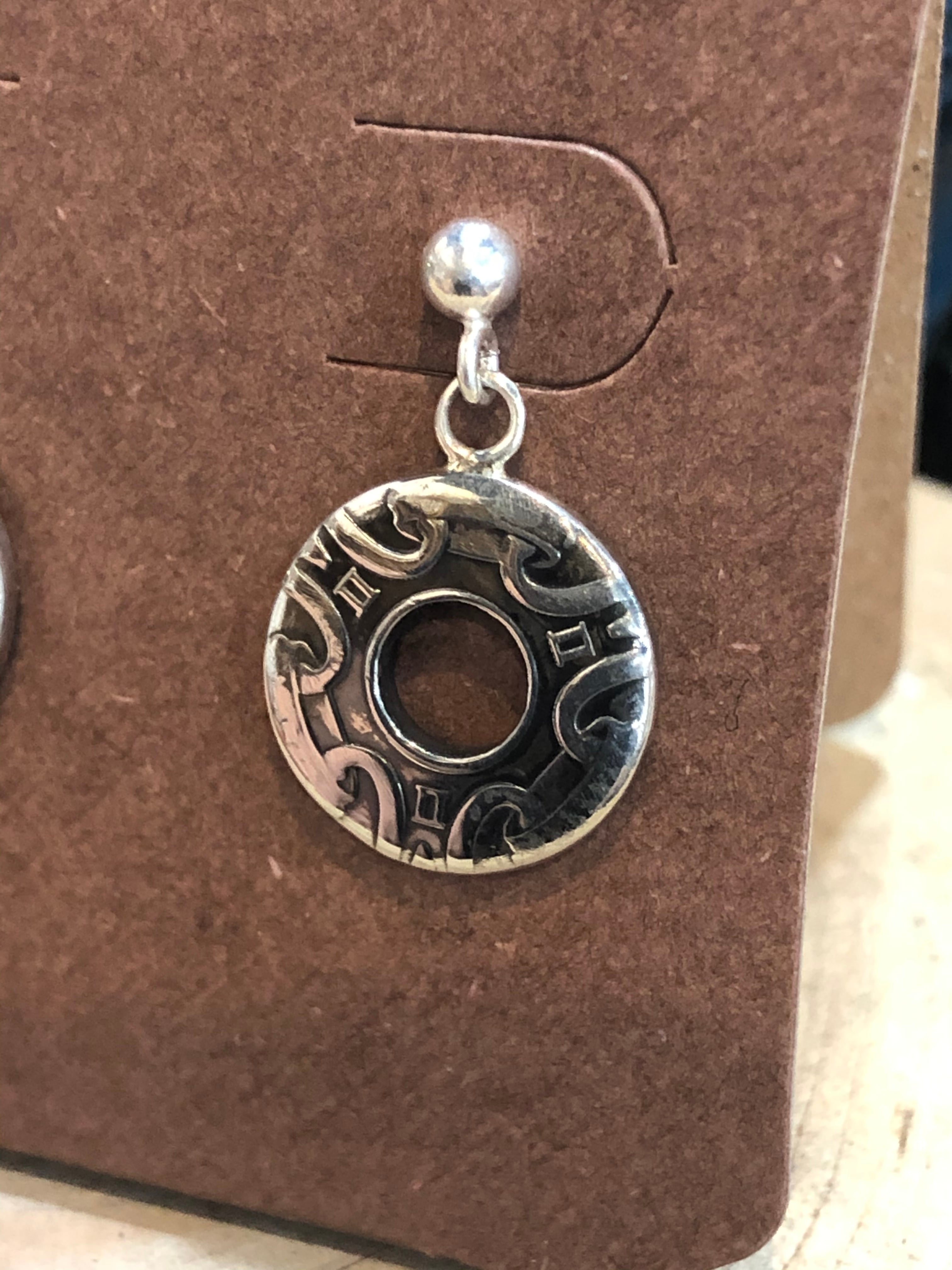 紹介させて頂く商品は、デンマーククローネコインを素材でリングを作った際に出来た端材を使って、端材に穴をあけずに上面に丸カンをロウ付けして作成したピアスです。