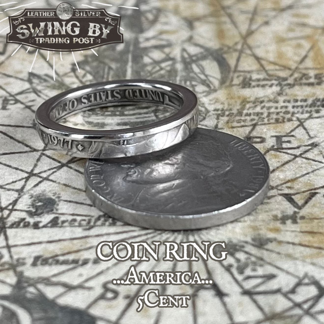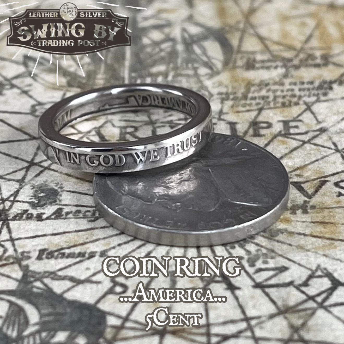 アメリカ5セントコインリングは細めのすっきりしたシルバーリングに仕上がります。外側には「IN GOD WE TRUST」「LIBERTY」「年号」、内側には「E PLURIBUS UNUM」「UNITED STATES OF AMERICA」の文字がデザインされています。リングの幅は3mmと細めなので、文字のみが入るシンプルなデザインですので、ペアリングとして付けられてもおしゃれです。