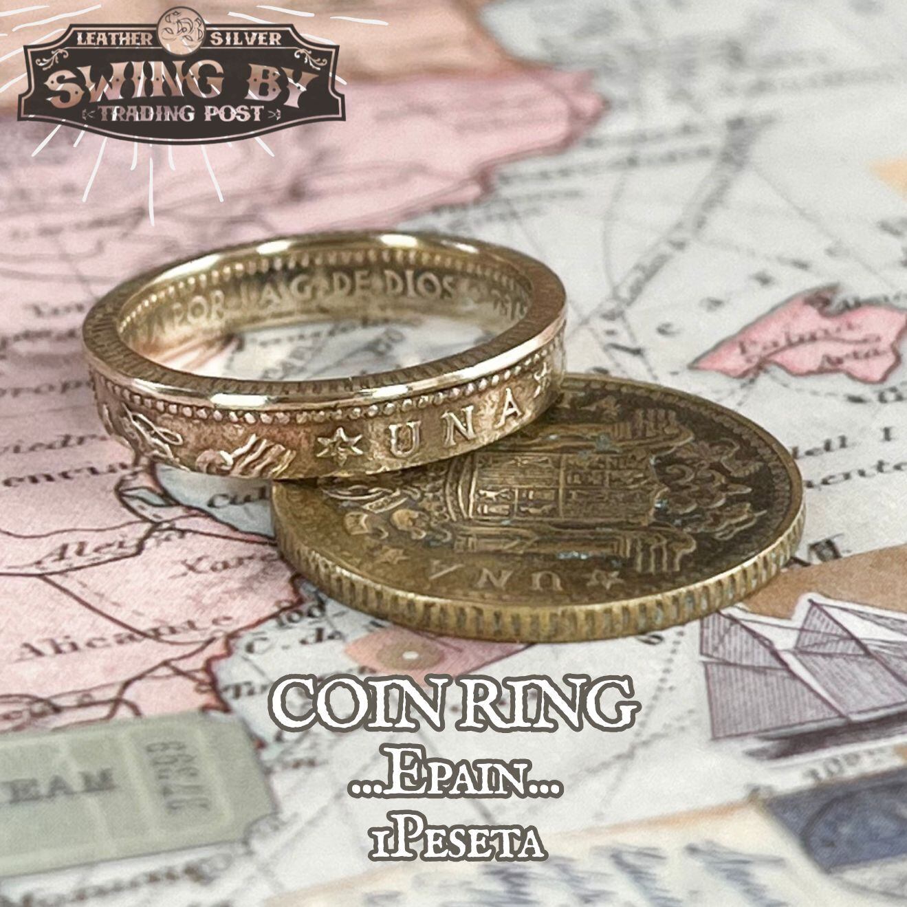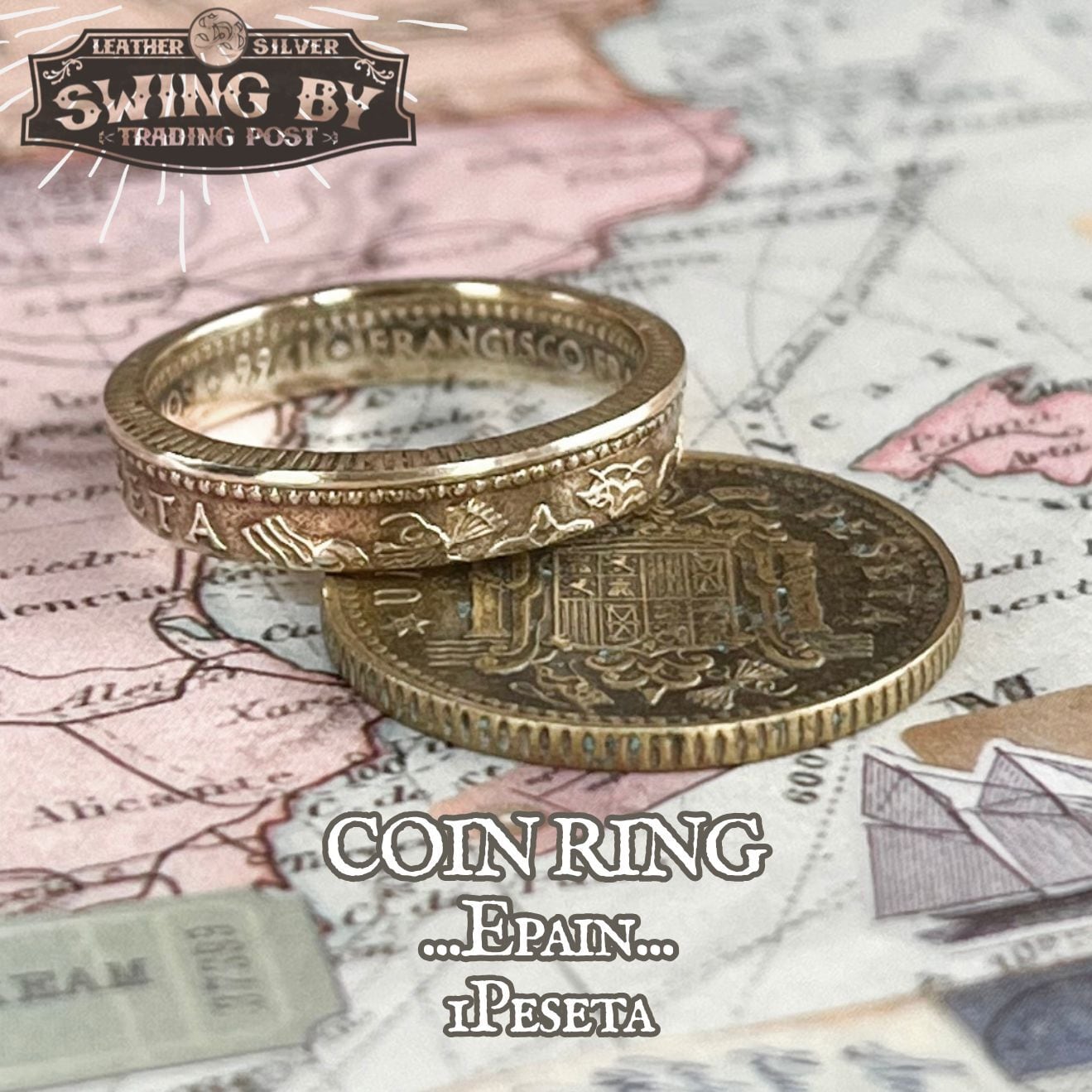 リングの外側には「UNA」「PESETA」文字と程よく柄も入っており、おしゃれなコインリングに仕上がります。また文字の上部の点線もアクセントとなりますね。内側には「FRAANCISCO FRANCO CAUDILLO DE ESPANA PORLA G.DE DIOS」文字の歴史を辿って見るとその国の時代背景も見え、思い入れの深いコインリングになります。